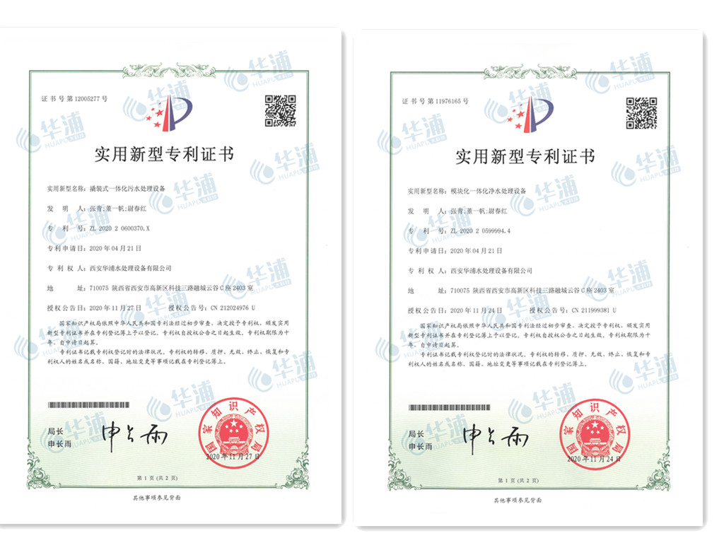 近日,華浦水科技自主研發(fā)的“撬裝式一體化凈水處理設(shè)備”和“模塊化一體化污水處理設(shè)備”兩項(xiàng)裝置獲得了國(guó)家知識(shí)產(chǎn)權(quán)實(shí)用新型專(zhuān)利。