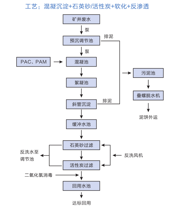 凈化處理技術(shù)主要有沉淀、混凝沉淀、混凝沉淀過濾(混凝澄清過濾)等,根據(jù)處理后不同的用途采用不同的工藝組合。