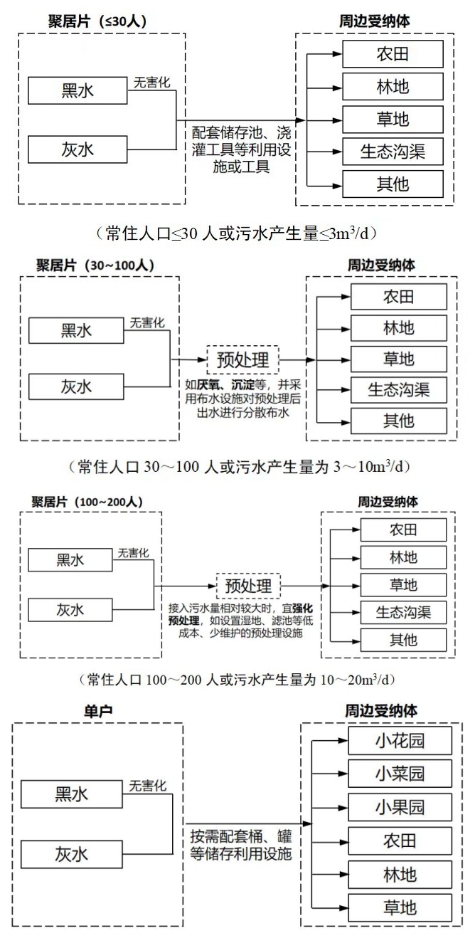 3、以村莊常住人口數(shù)、污水產(chǎn)生量將資源化利用分為零散戶(hù)和聚居片2類(lèi)4種情況,細(xì)化了污水資源化利用各環(huán)節(jié)的要求。